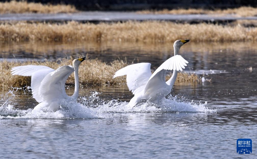 3月4日,天鹅在密云水库流域的清水河嬉戏。