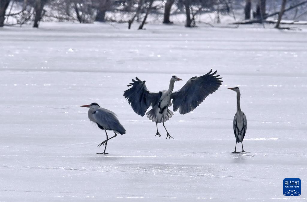 3月4日,苍鹭在密云水库未融化的冰面上嬉戏。