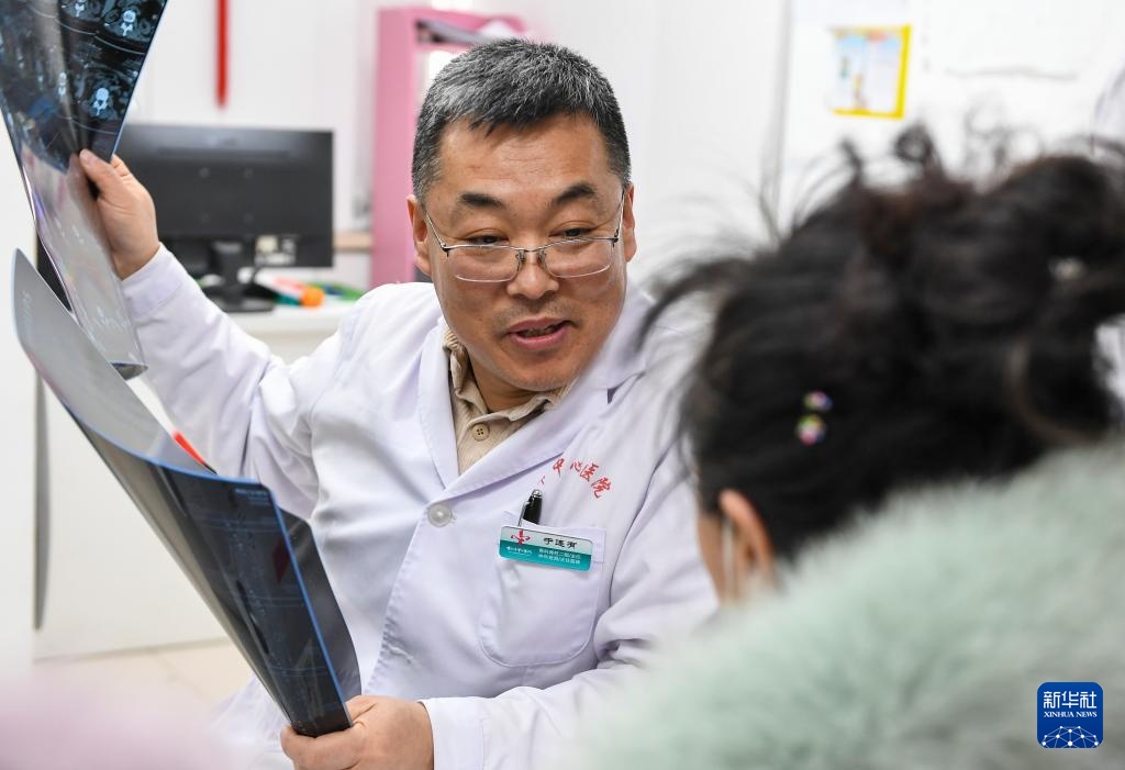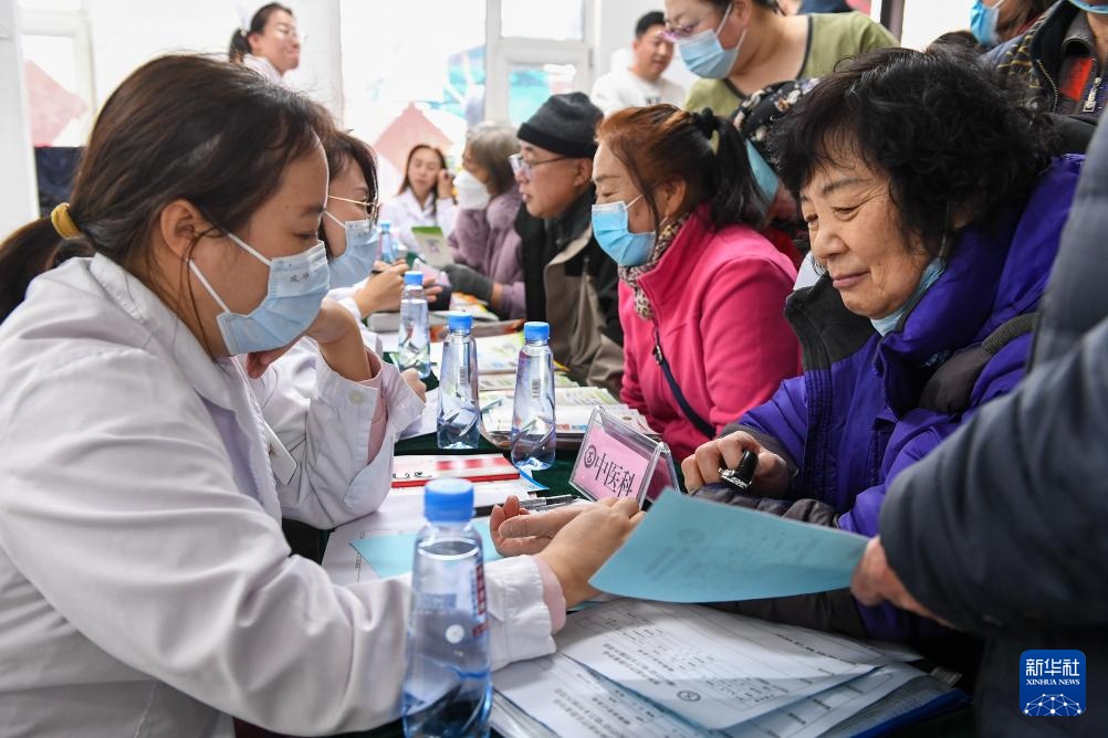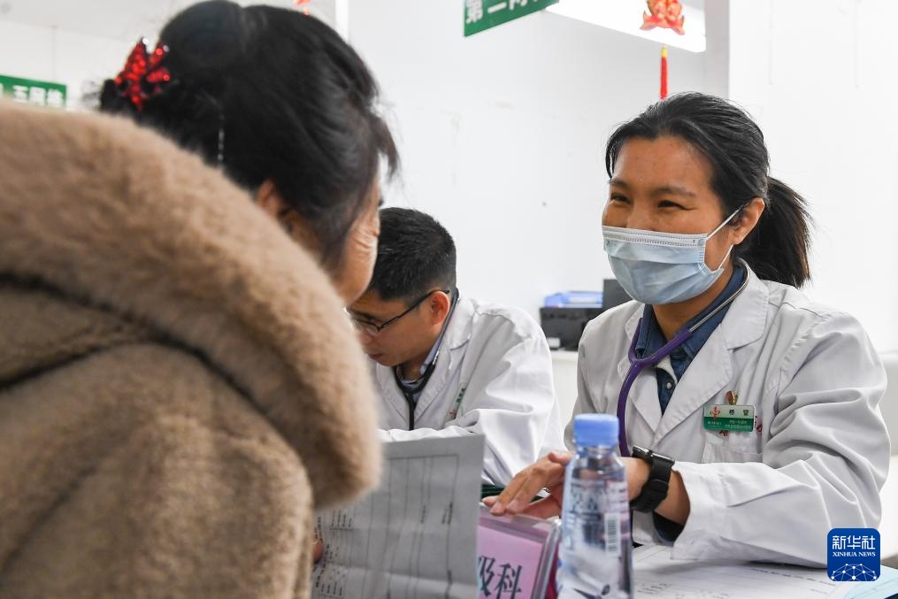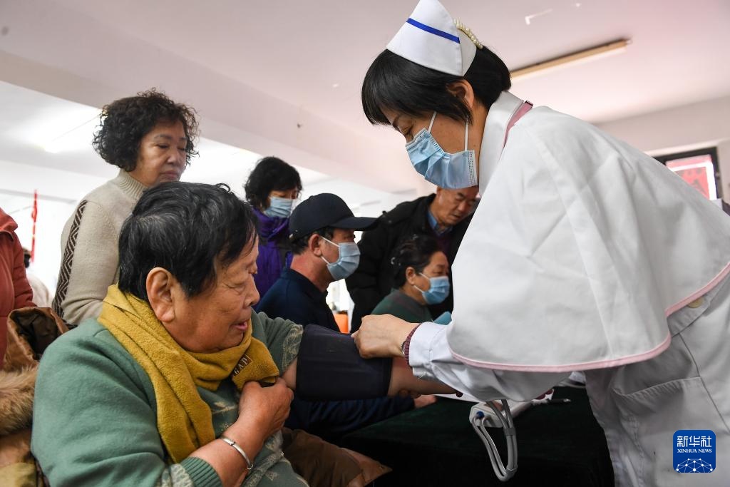 3月4日,在吉林省吉林市田园社区,吉林市医疗志愿者协会志愿者为居民检查身体。