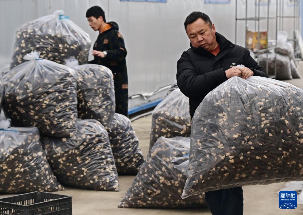 山东省莱西市夏格庄镇西夏格庄村,村民在搬运已烘干的羊肚菌(3月4日摄)。