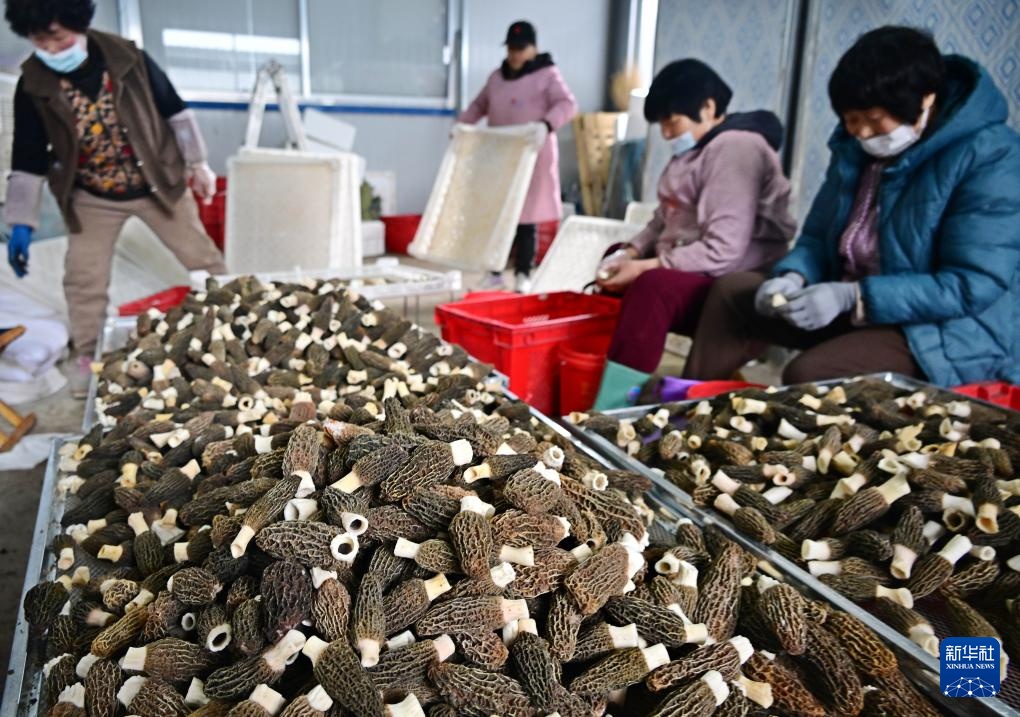 山东省莱西市夏格庄镇西夏格庄村,村民在分拣、加工羊肚菌(3月4日摄)。