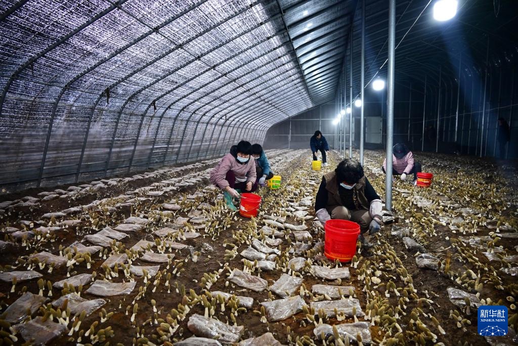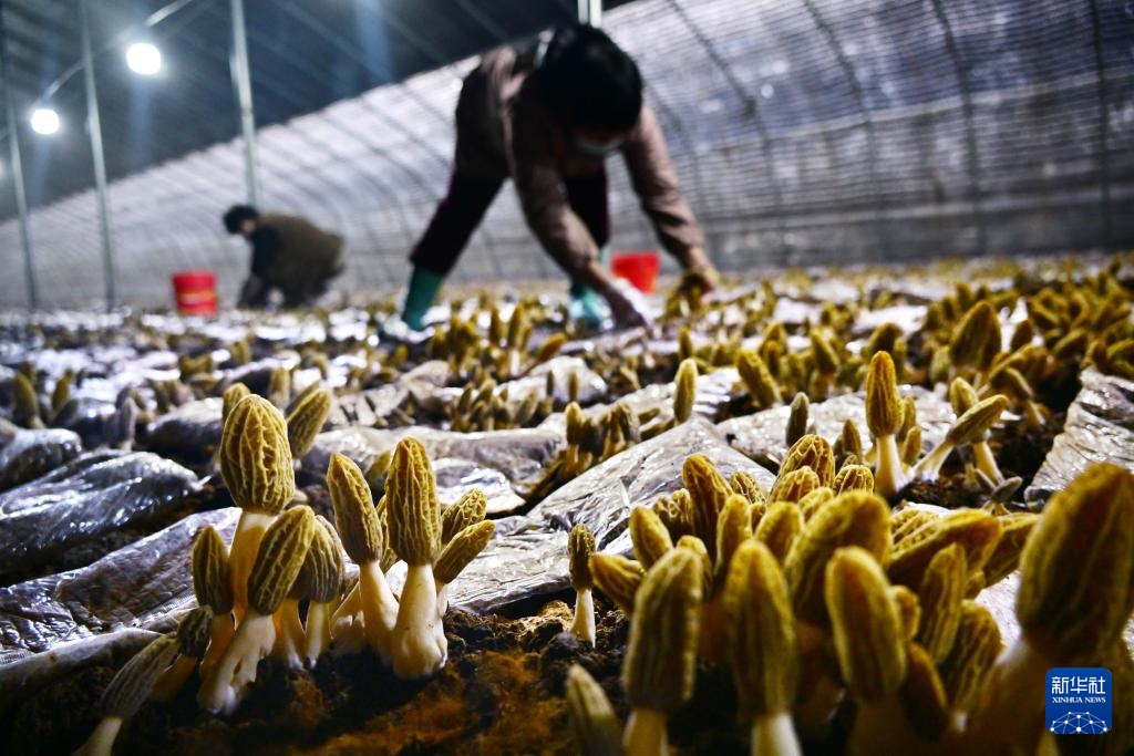 山东省莱西市夏格庄镇西夏格庄村,农民在大棚里采收羊肚菌(3月4日摄)。
