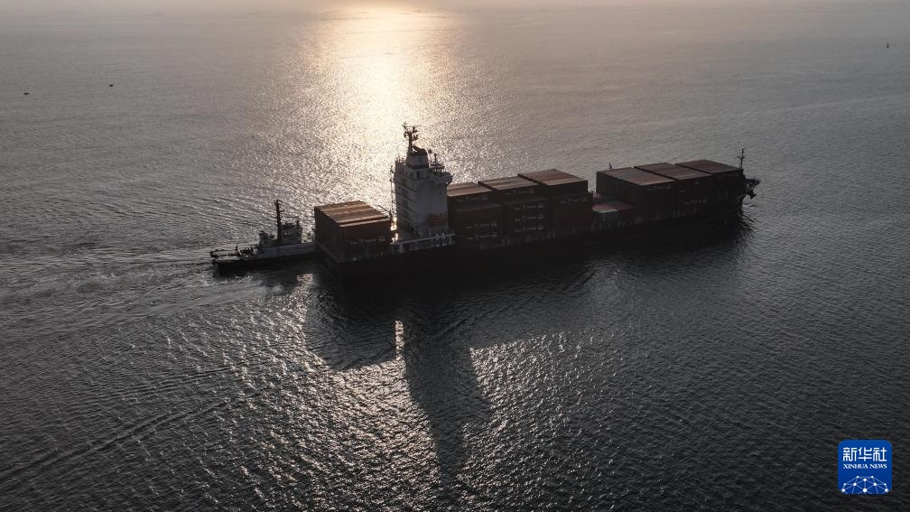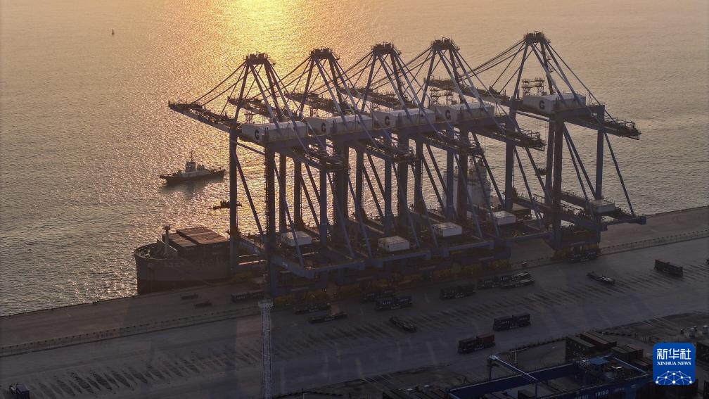 3月4日,一艘海轮在钦州港集装箱自动化码头下卸集装箱(无人机照片)。