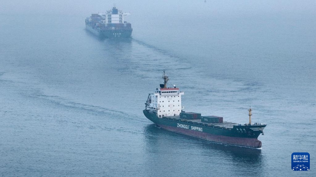 3月4日,在钦州茅尾海上,海轮往来穿行转运钦州港码头货物(无人机照片)。