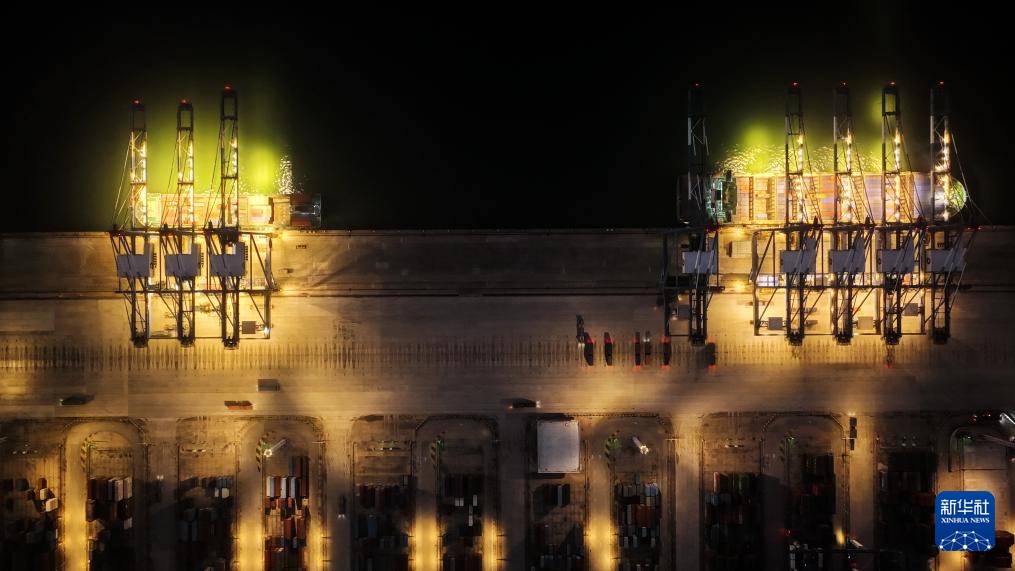 3月4日拍摄的进行夜间作业的钦州港集装箱自动化码头(无人机照片)。