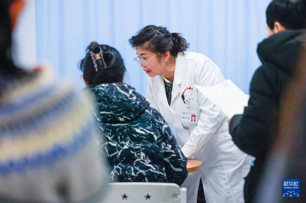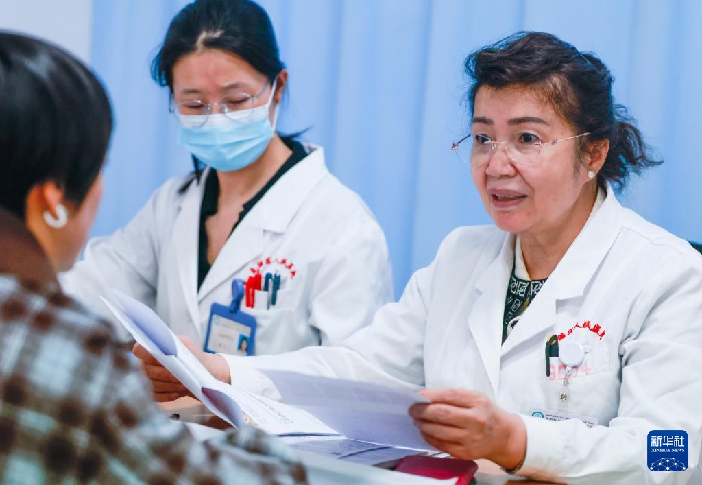 3月4日,在新疆维吾尔自治区妇幼保健院病房,玛依努尔·尼牙孜(左二)查房时与医护人员交流。