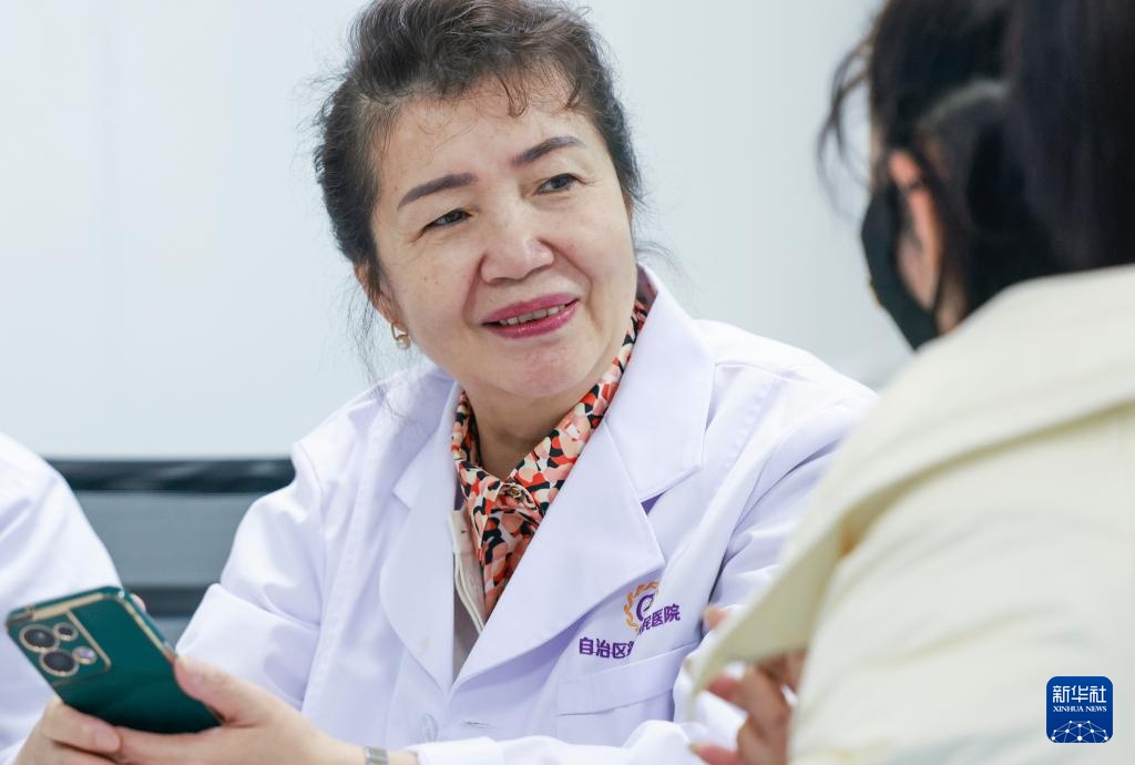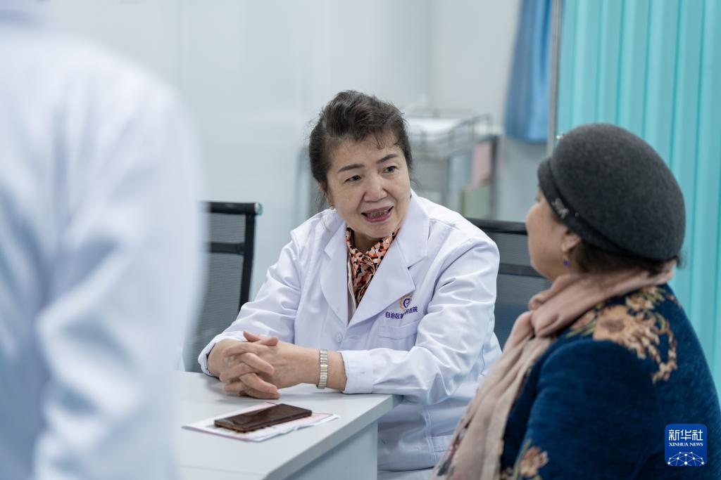 3月3日,玛依努尔·尼牙孜(右)在新疆维吾尔自治区人民医院为患者诊疗。