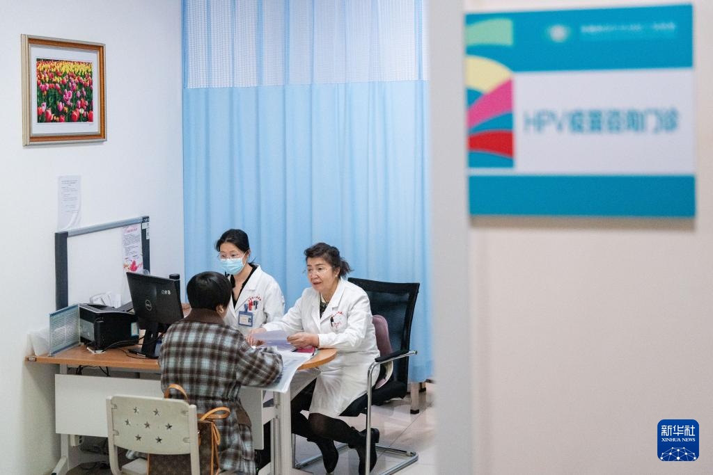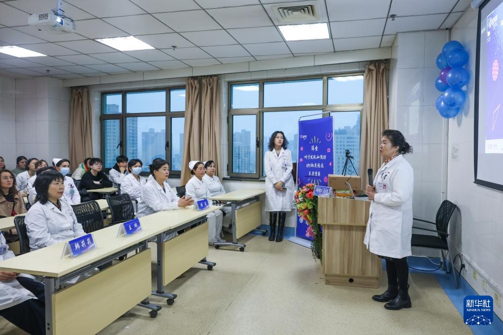 3月4日,玛依努尔·尼牙孜(右一)在HPV知晓日活动新疆维吾尔自治区人民医院分会场致辞。