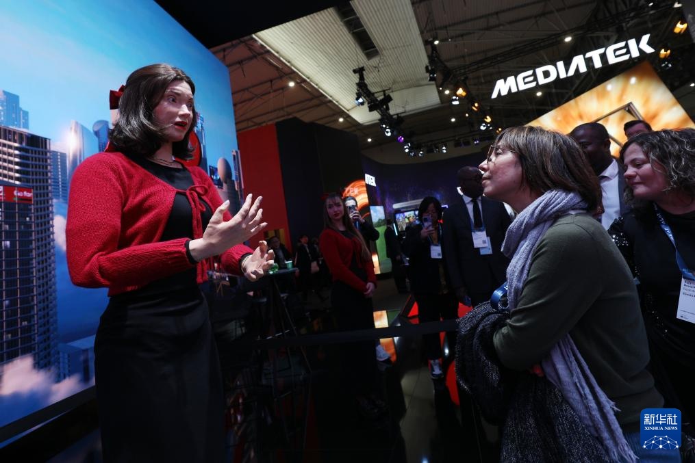 3月5日,人们在西班牙巴塞罗那举行的2025年世界移动通信大会上同机器人(左)互动。