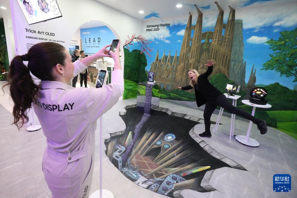 3月5日,人们在西班牙巴塞罗那举行的2025年世界移动通信大会三星展区参观体验。