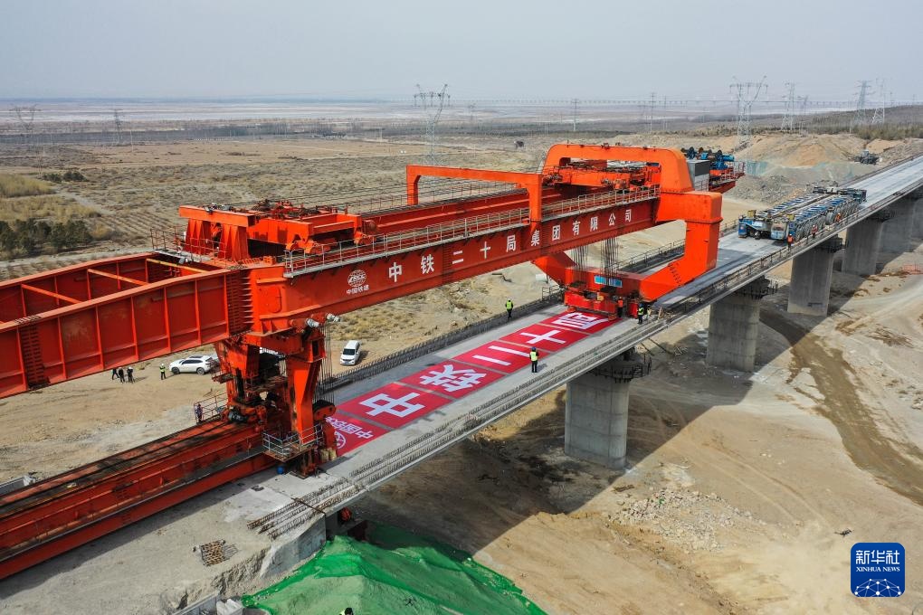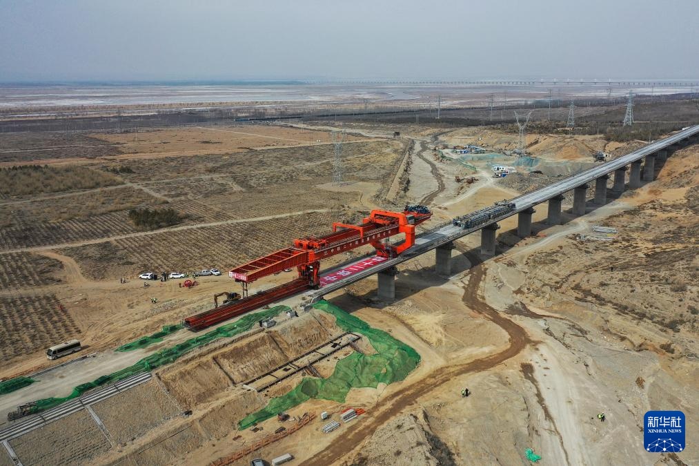 这是3月6日拍摄的包银高铁河源村特大桥合龙施工现场(无人机照片)。