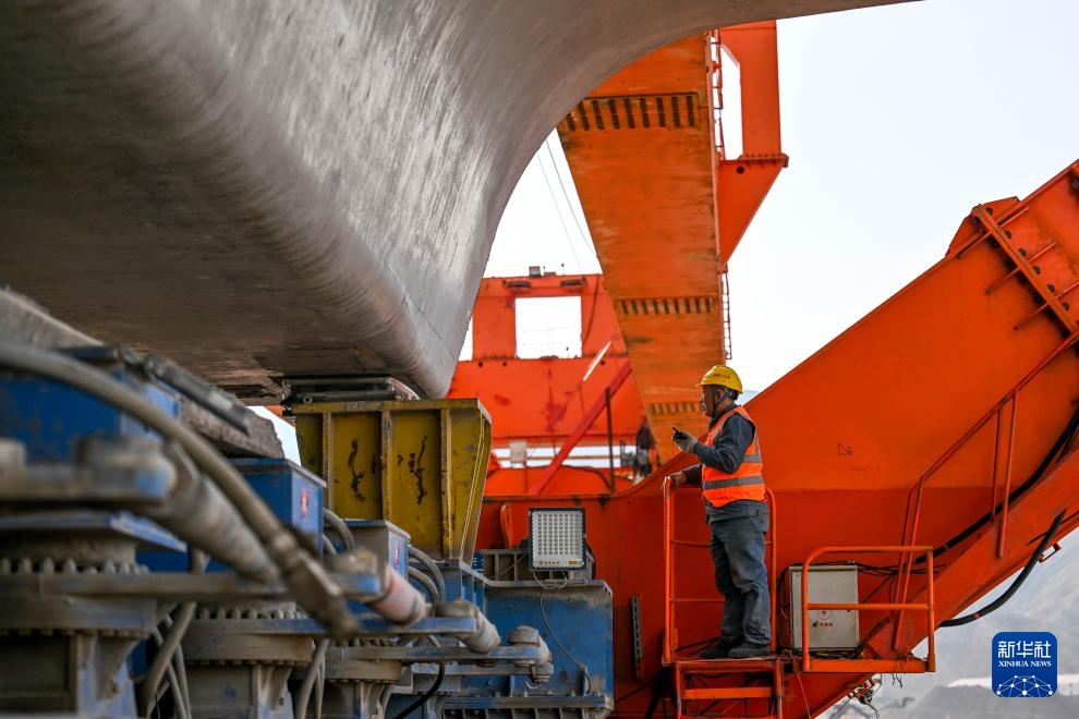 3月6日,工人在包银高铁河源村特大桥合龙施工现场作业。