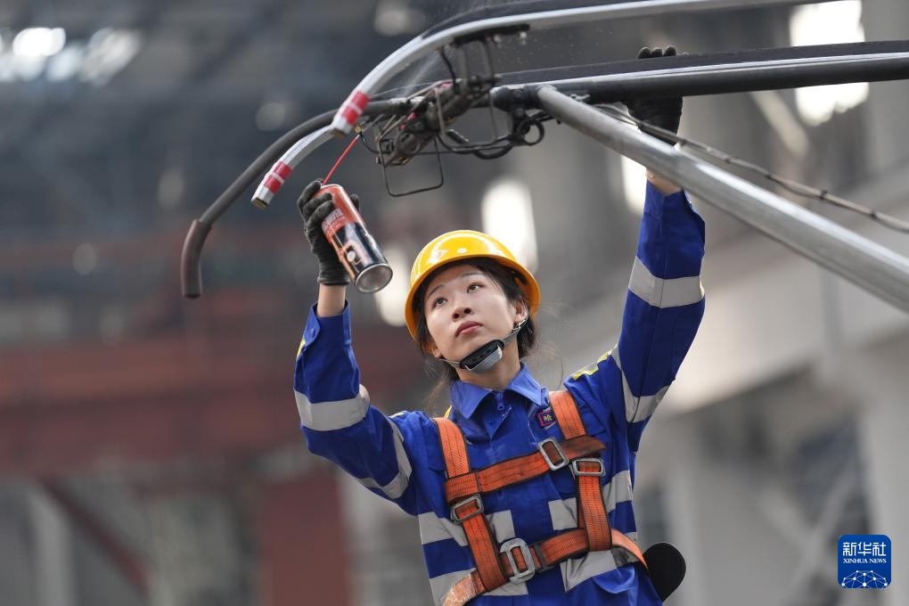在中国铁路哈尔滨局集团有限公司哈尔滨机务段检修库内,机车钳工王嘉仪在对机车车顶受电弓进行检修作业(3月6日摄)。