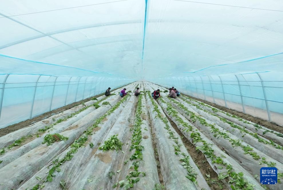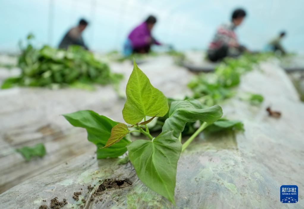 3月7日,在河北省行唐县南桥镇东安太庄村,一家红薯种植合作社的社员在扩繁大棚内栽植脱毒红薯秧苗。