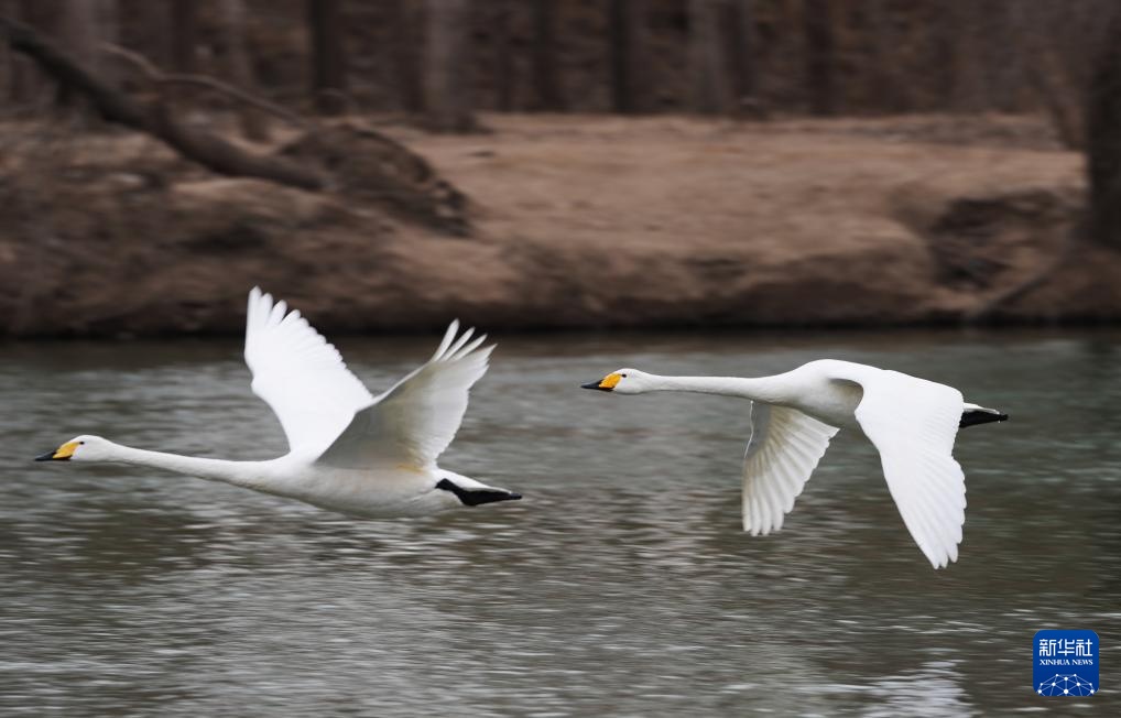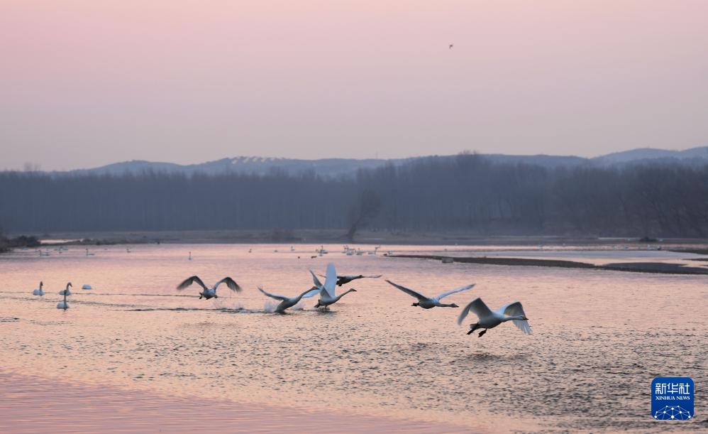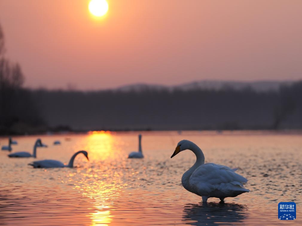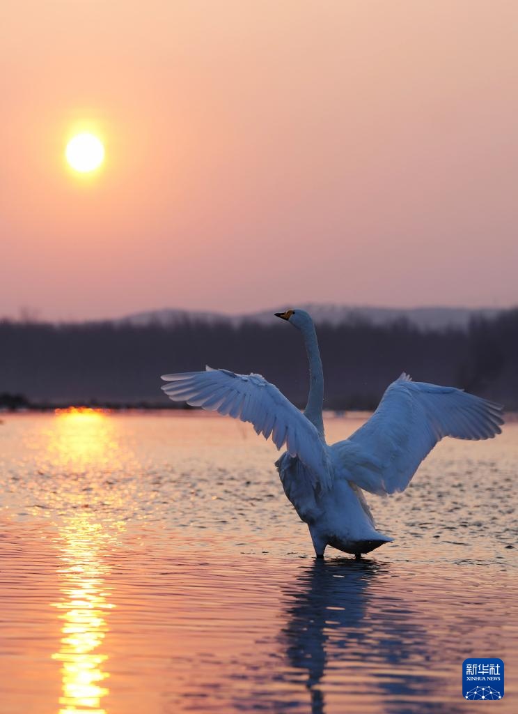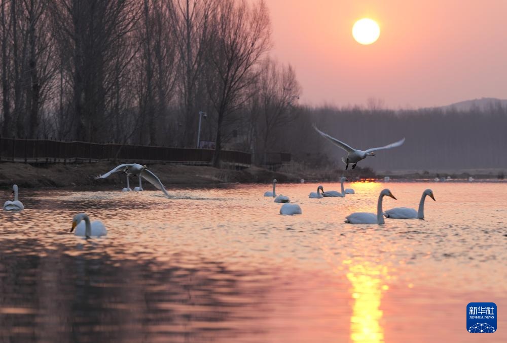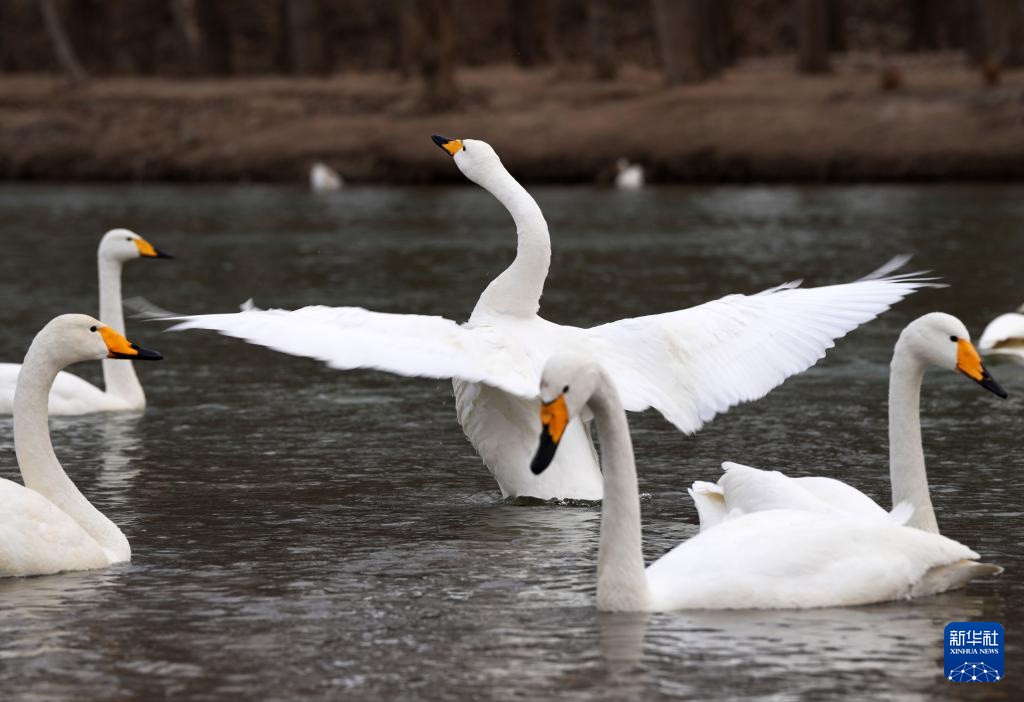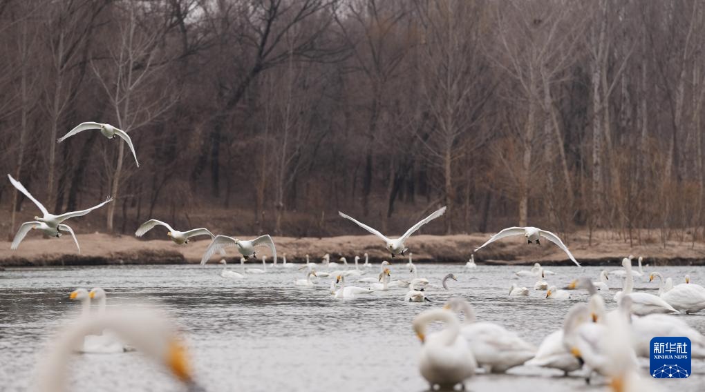 天气转暖,在辽宁省朝阳市的北票市红村天鹅湾,数百只迁徙的大天鹅在这里落脚停歇,觅食休整。