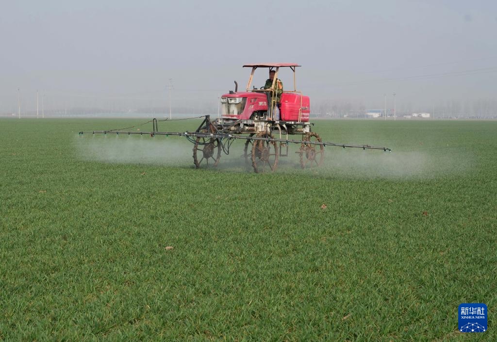 3月8日,邢台市南和区阎里乡阎里村的农民在驾驶农机给冬小麦喷洒杀菌剂。