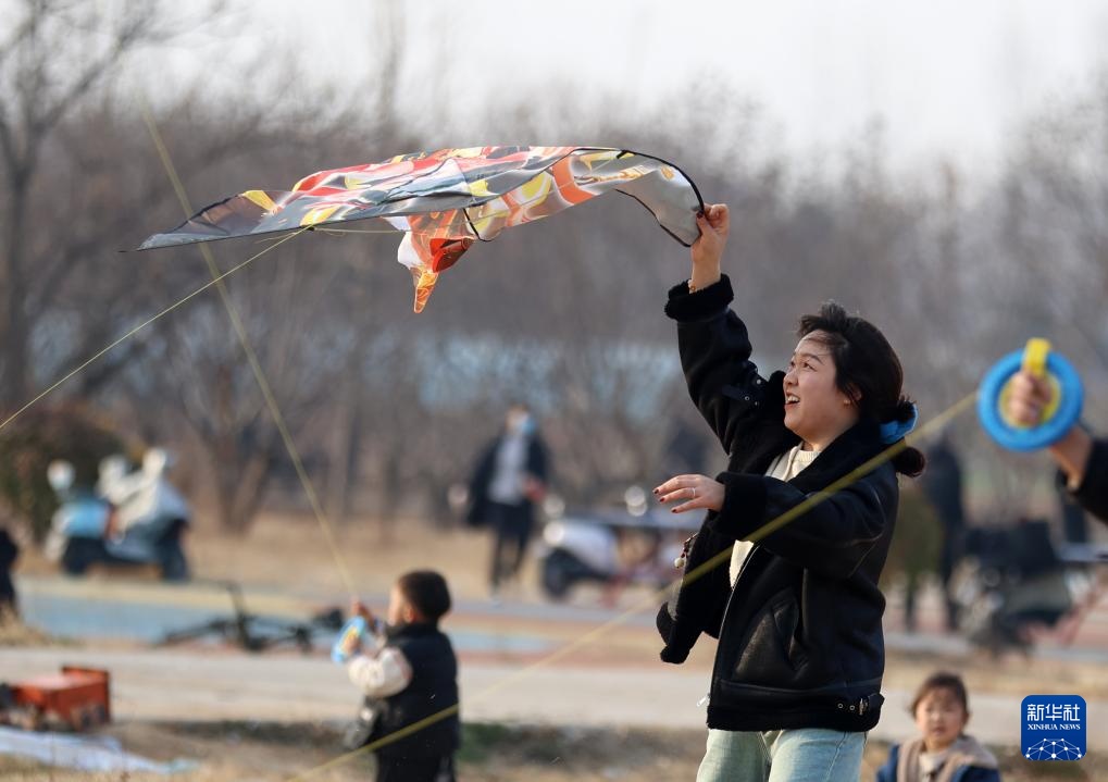 3月9日,人们在山东省临沂市郯城县市民休闲体育公园放风筝。