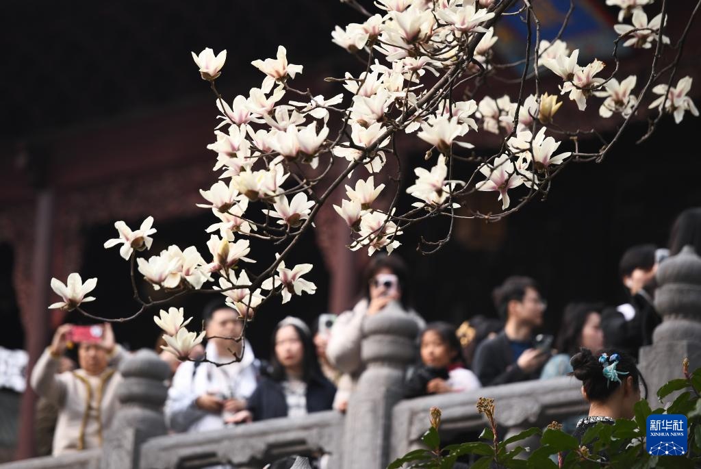 3月9日,游客在南京朝天宫观赏拍摄玉兰花。