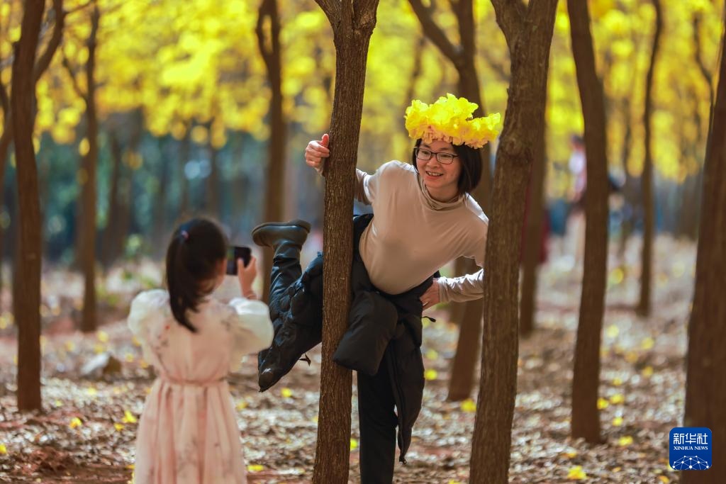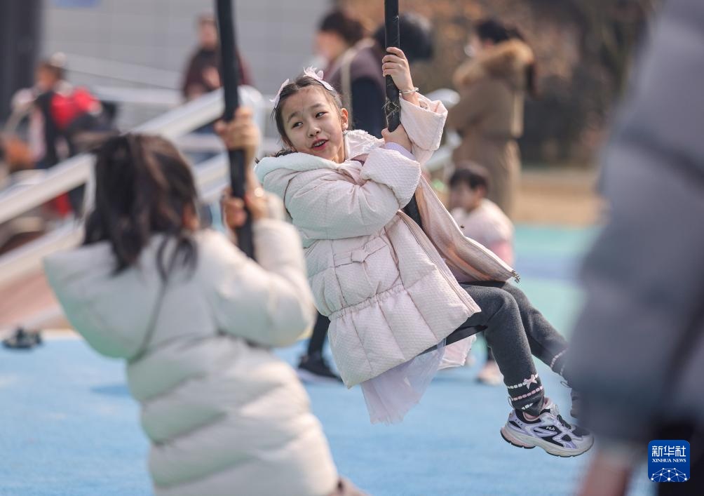 3月9日,市民在山东省荣成市桑干河植物园一处口袋公园游玩休闲。
