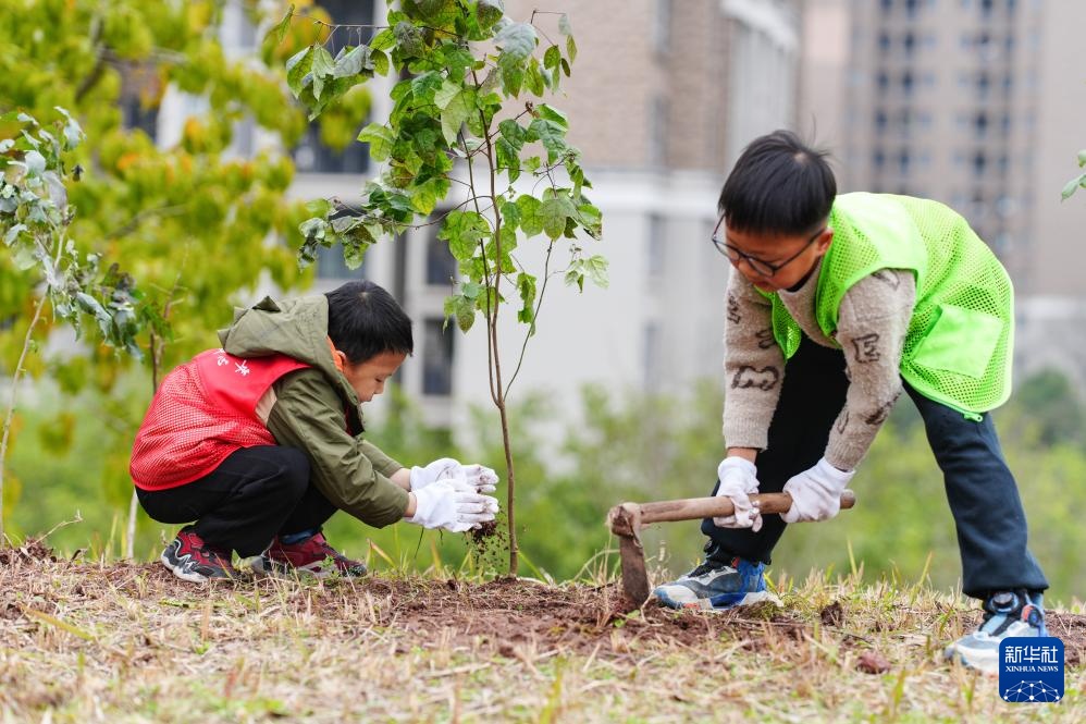 3月9日,小朋友在重庆市北碚区水土街道万寿社区健康健身公园进行义务植树。