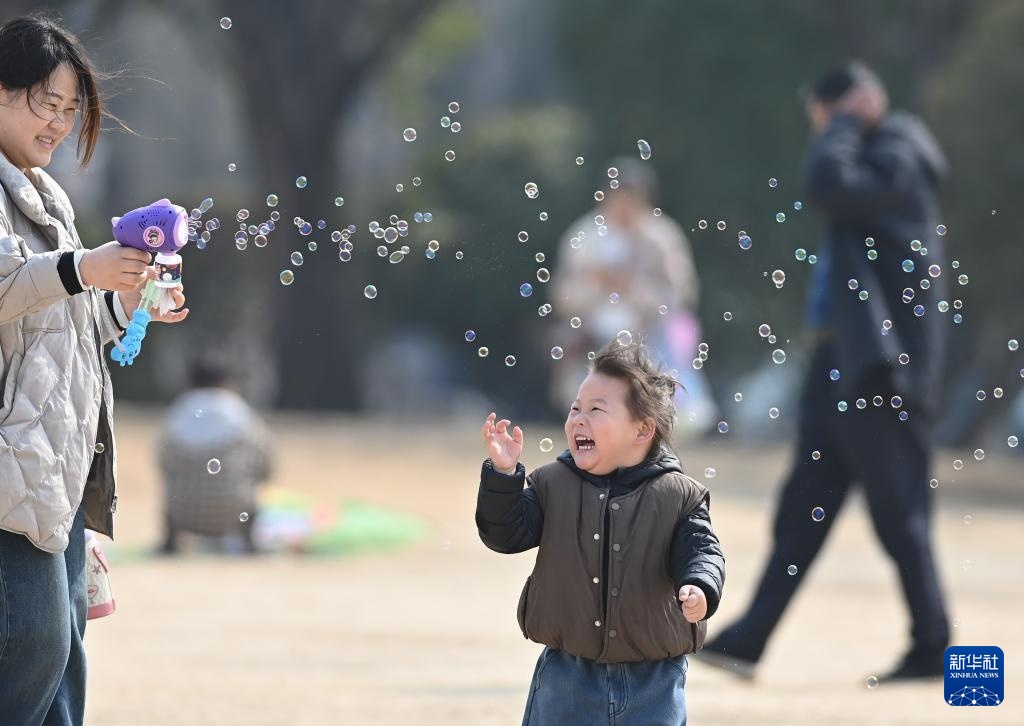 3月9日,家长和孩子在山东省滕州市一处公园玩泡泡。