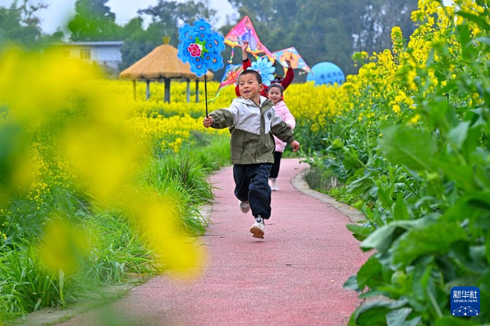 3月9日,小朋友在四川省眉山市仁寿县青岗乡盘龙村的油菜花丛中游玩。