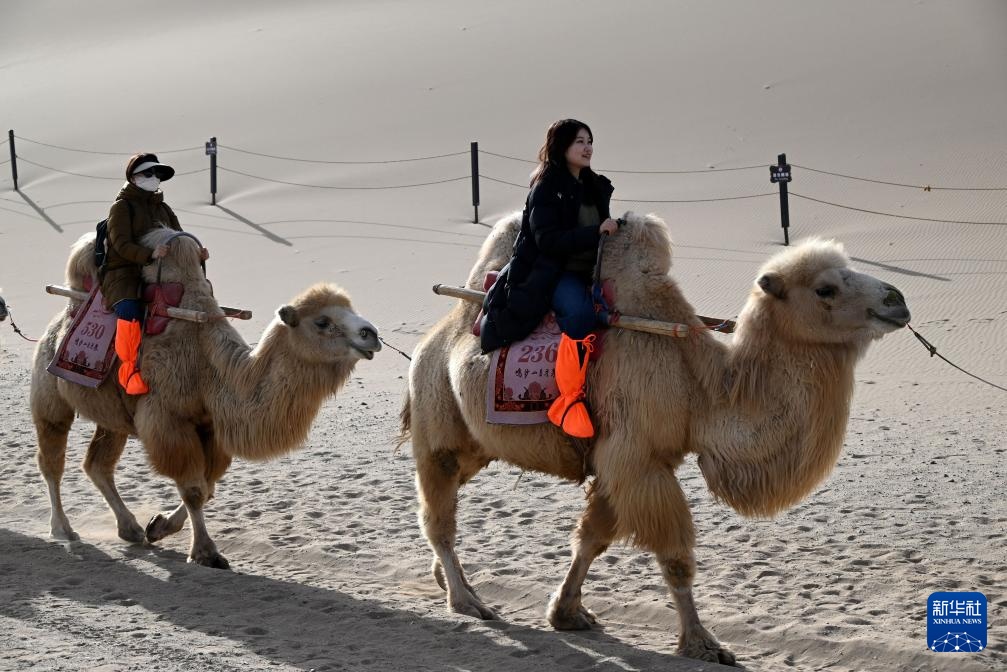 3月8日,人们在甘肃省敦煌市鸣沙山月牙泉景区骑骆驼游览。
