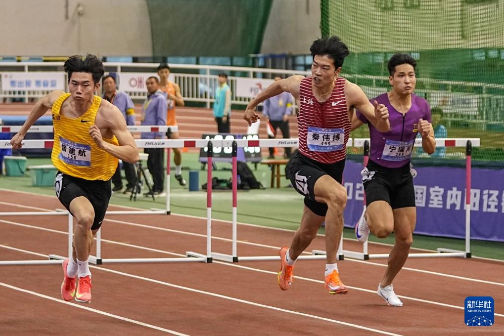 3月9日,上海队选手秦伟搏(中)在男子60米栏决赛中。他以7秒56的成绩获得冠军。