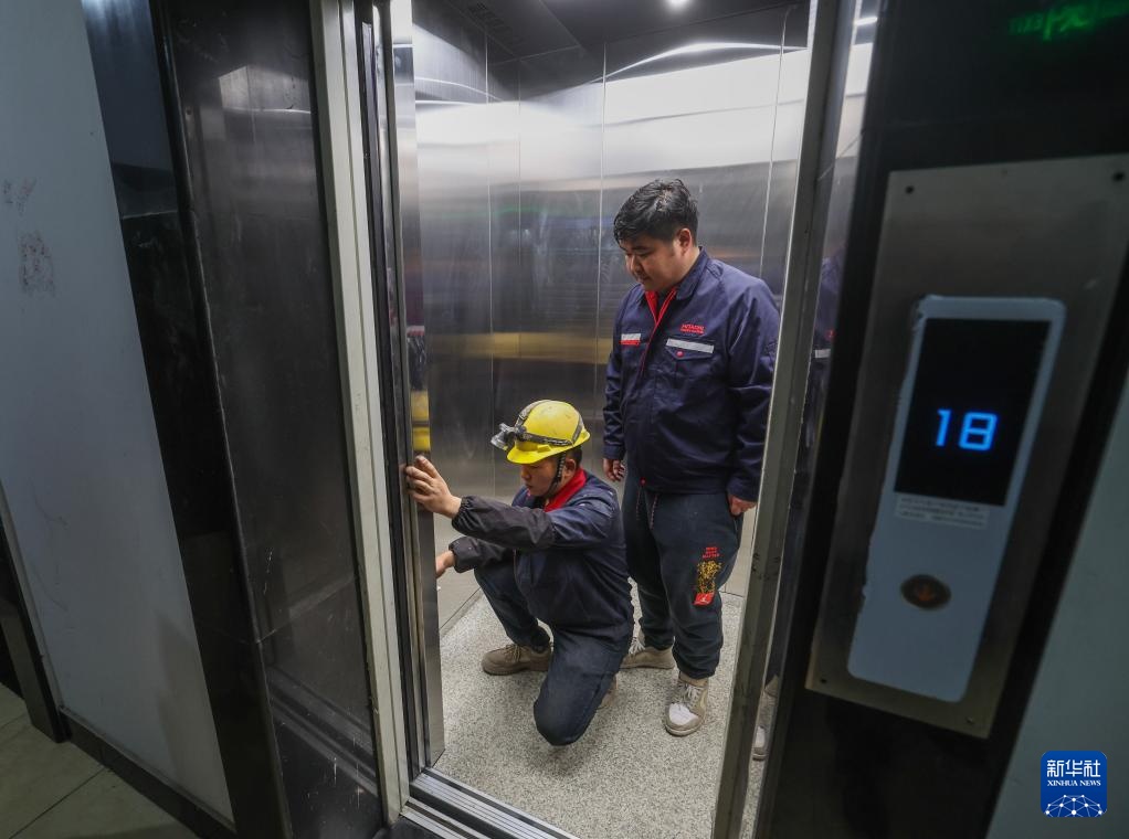 3月11日,在慈溪市浒山街道虞家路社区高丰家园小区内,电梯施工人员在检查更新完成的新电梯门机的运行情况。