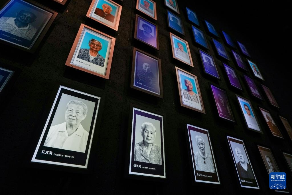 这是侵华日军南京大屠杀遇难同胞纪念馆内大屠杀幸存者照片墙上艾义英、伍秀英、易兰英、陶承义(最下排从左到右)的照片灯箱(3月11日摄)。