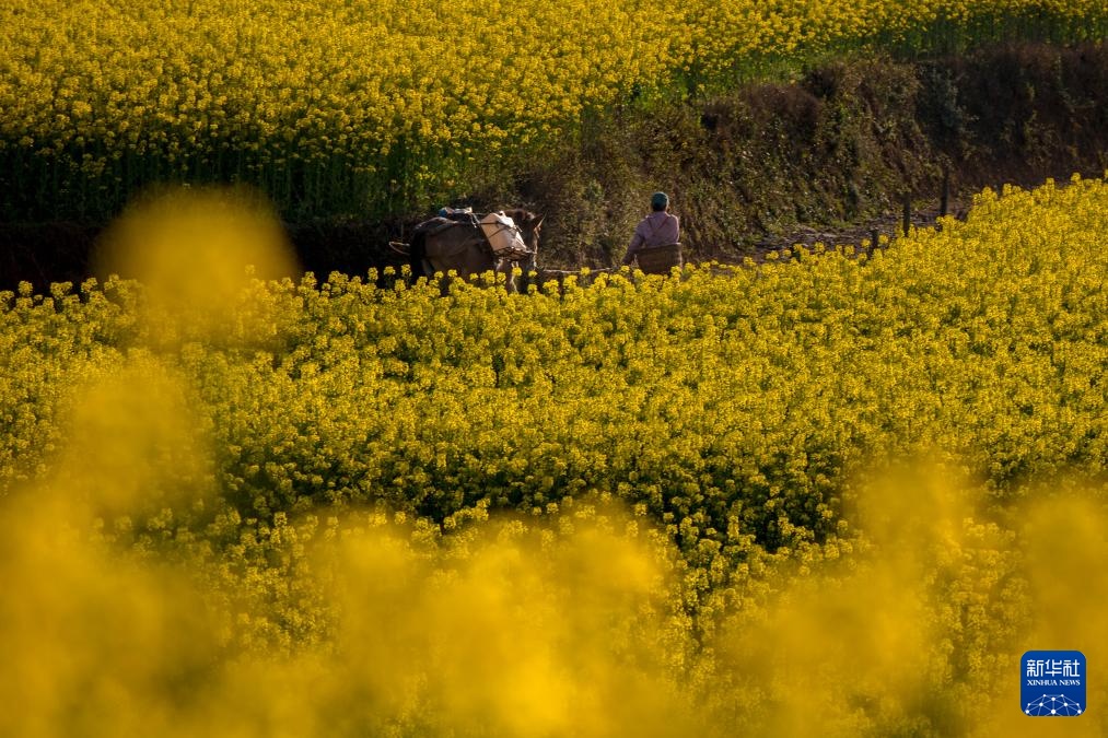 3月11日,村民行走在云南省罗平县马街镇革岗村的油菜花田间。