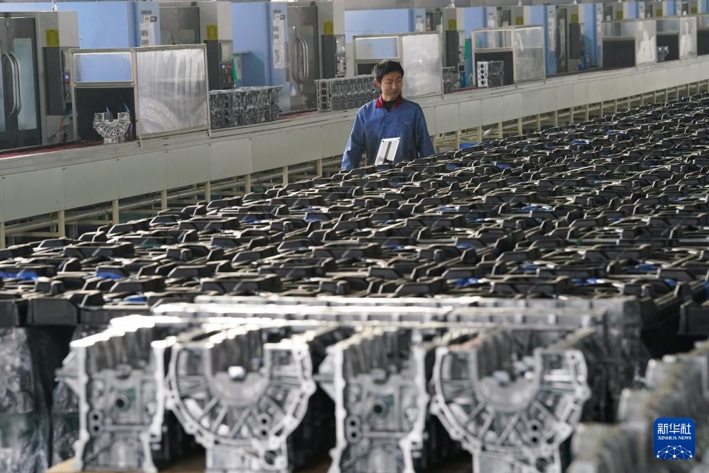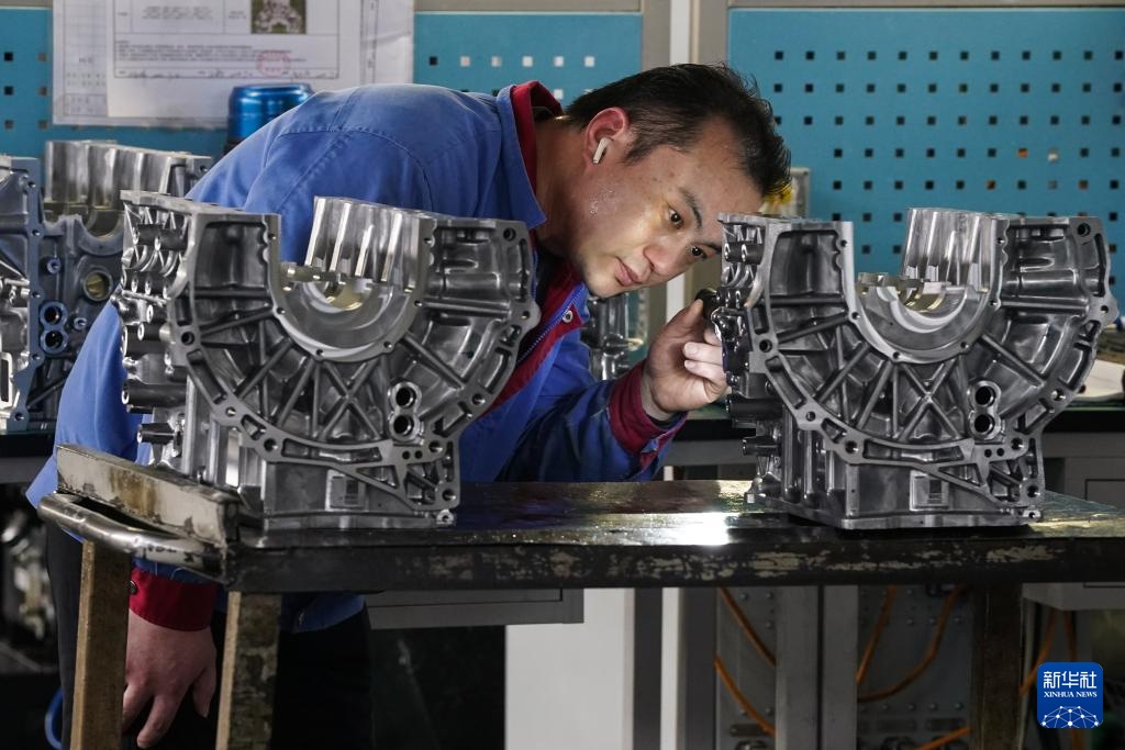 3月11日,工人在滁州悦达实业有限公司检查混动发动机缸体。