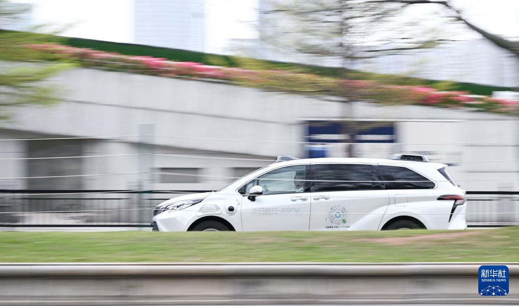 3月11日,配备有安全员的小马智行自动驾驶示范运营专线出租车行驶在广州塔附近道路上。