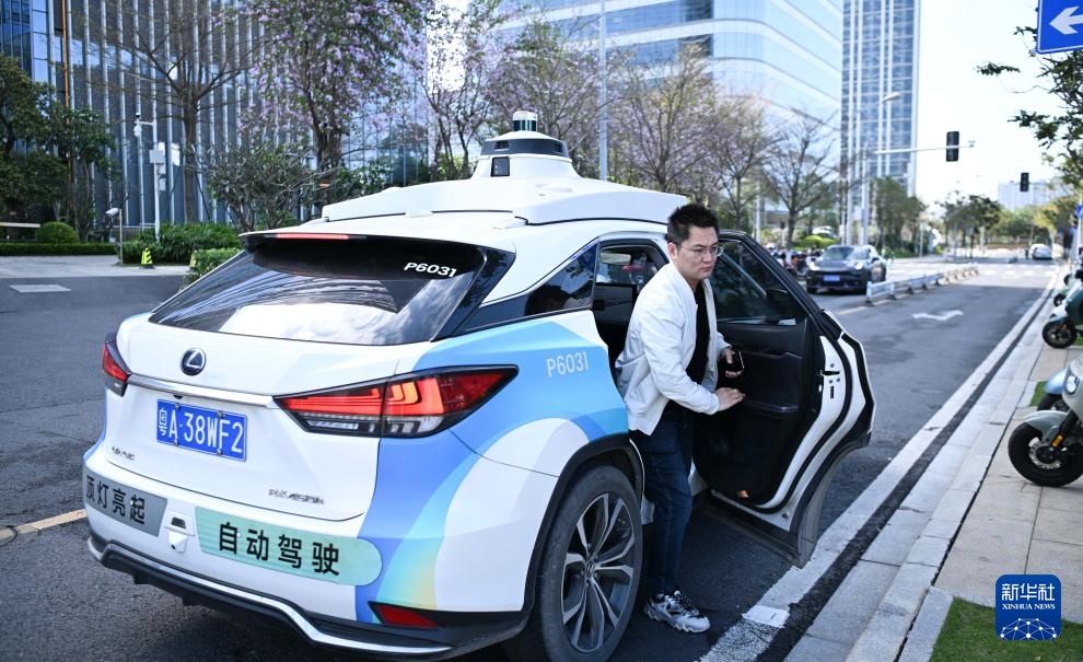 3月11日,在广州南沙区,搭乘小马智行自动驾驶无人商业化出租车的乘客到达目的地后下车。