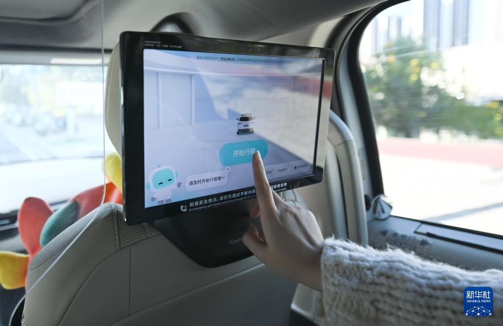 3月11日,在广州南沙区,乘客在小马智行自动驾驶无人商业化出租车上点击开始行程。