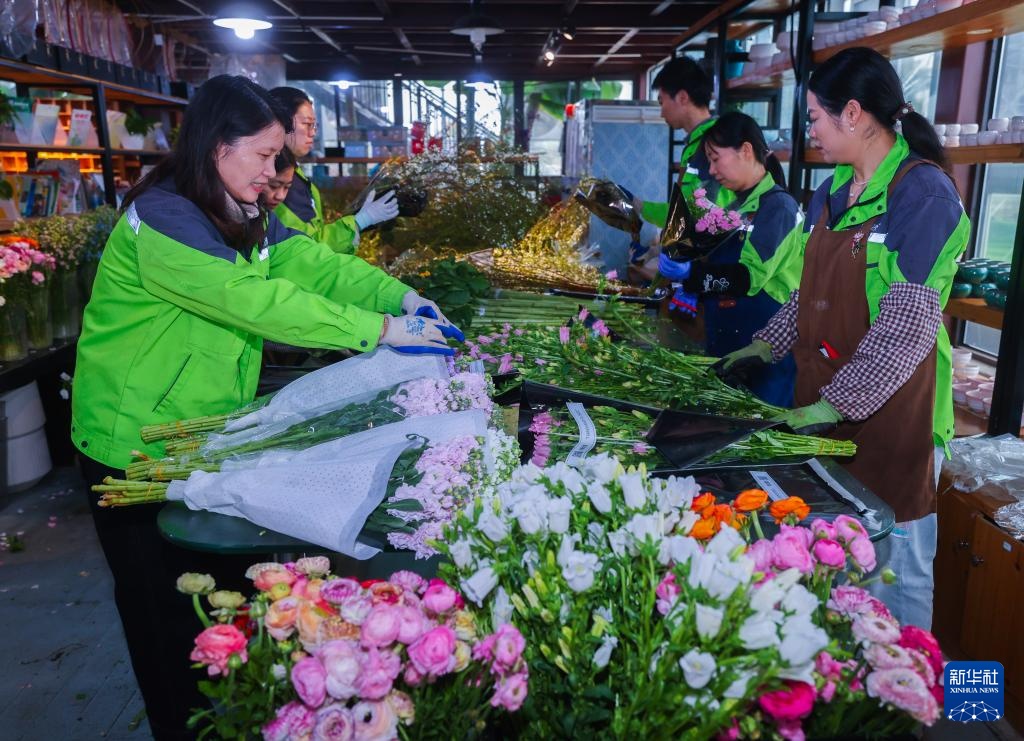 3月12日,在嘉兴市南湖区的嘉兴市神润斋鲜花种植基地,工作人员在打包鲜切花花束。
