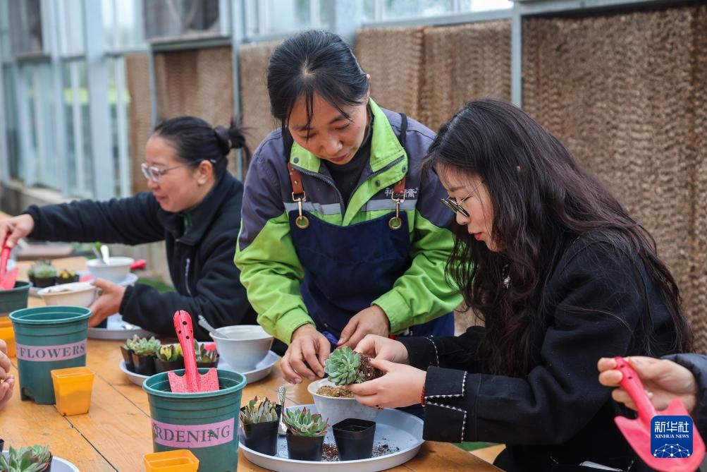 3月12日,在嘉兴市南湖区的嘉兴市神润斋鲜花种植基地,工作人员在教游客种植多肉植物。