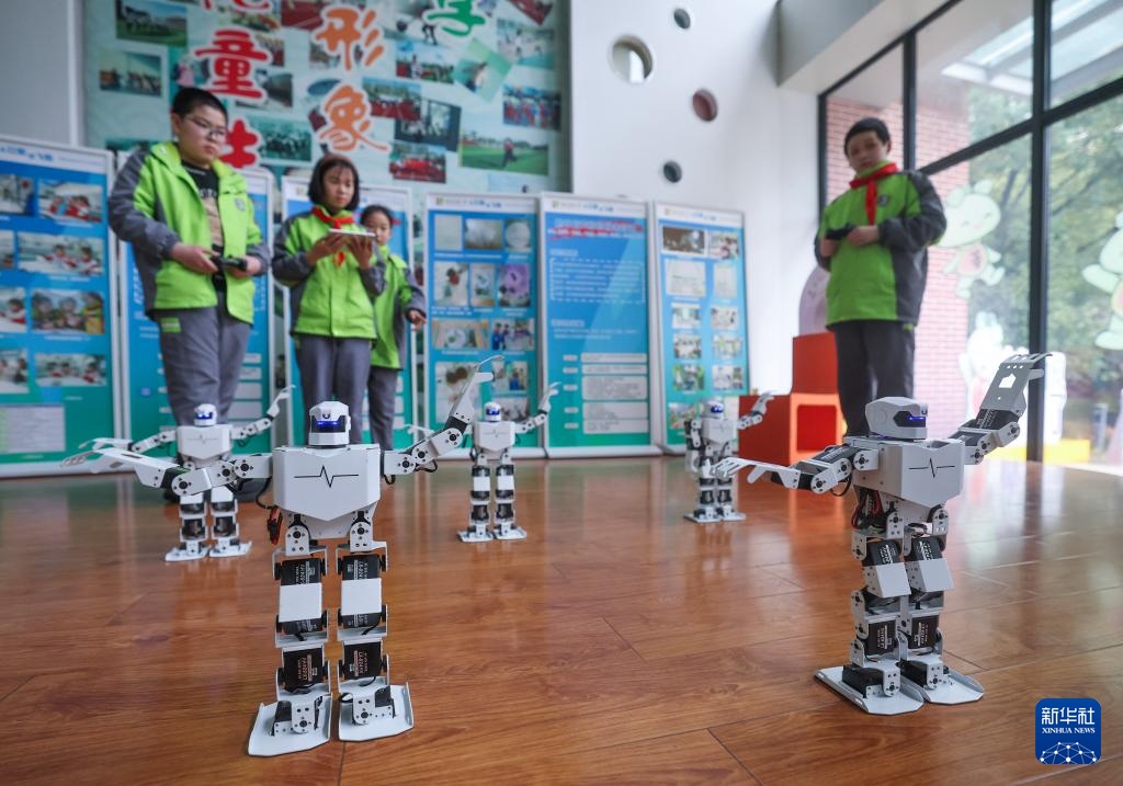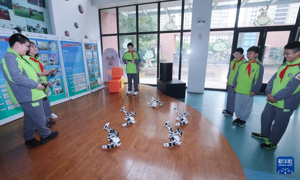 3月12日,在嘉兴市实验小学科技城校区科创中心内,智能机器人社团的学生们在对编码完成的智能机器人进行动作指令调试,并使用平板统一控制多台智能机器人完成精彩的舞蹈表演。该学校被评为全国人工智能教育示范基地。
