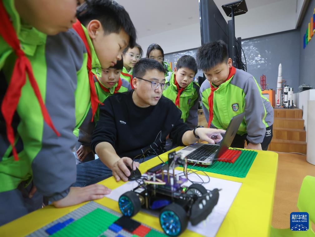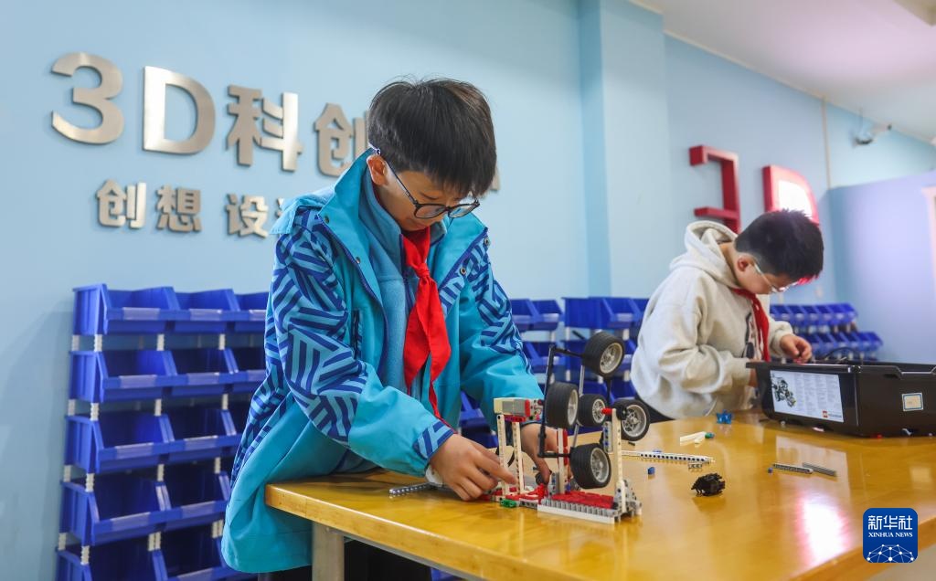 3月12日,在嘉兴市东北师范大学南湖实验教育集团科创中心教室,学生在搭建智能机器人。该教育集团被评为全国青少年人工智能活动特色单位。