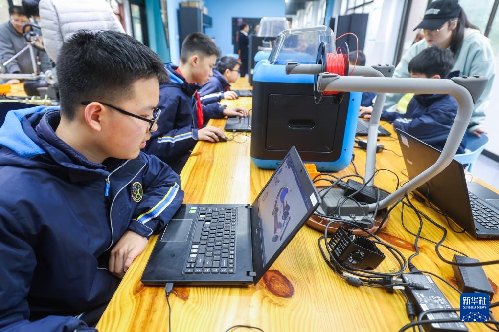 3月12日,在嘉兴市东北师范大学南湖实验教育集团汽车创客实验室内,学生运用AI技术设计并优化3D建模参数,然后用3D打印机打印模型。该教育集团被评为全国青少年人工智能活动特色单位。