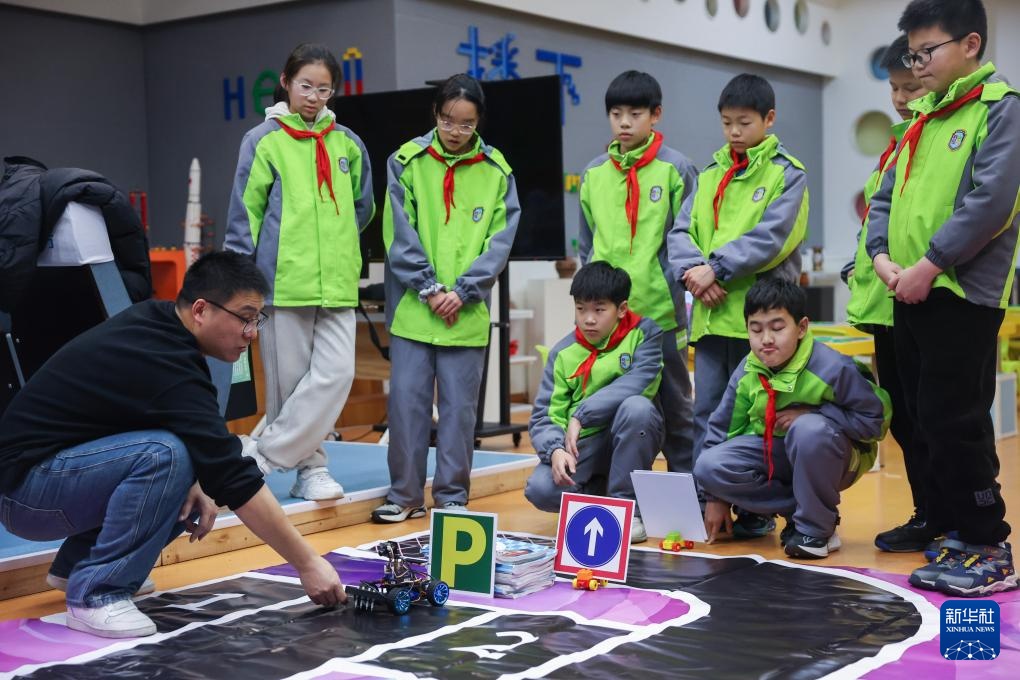 3月12日,在嘉兴市实验小学科技城校区科创中心内,老师指导学生通过编程为智能小车设计自动行驶算法,在模拟现实的路况中,自动识别道路和交通标志,实现自动驾驶。