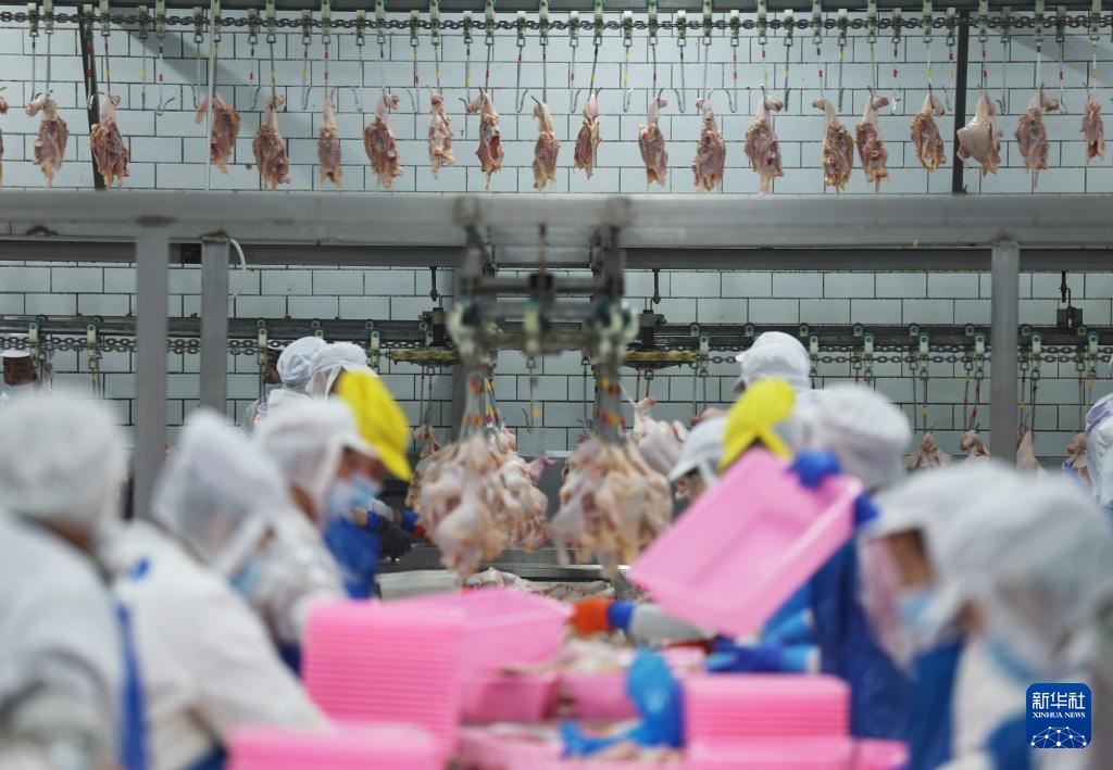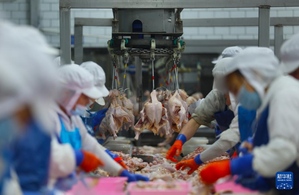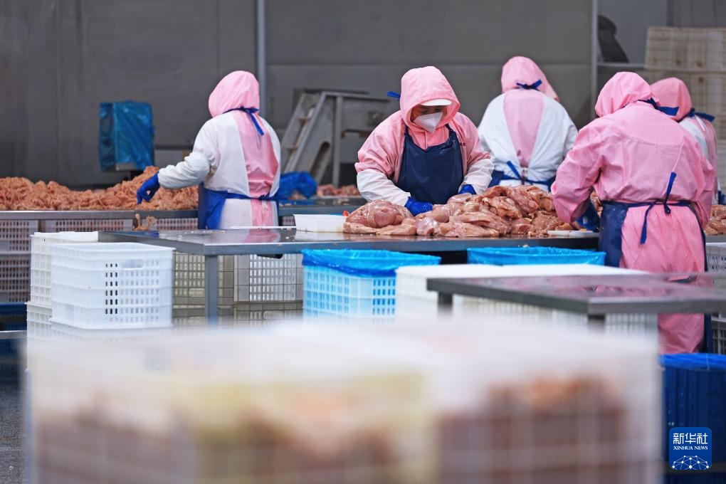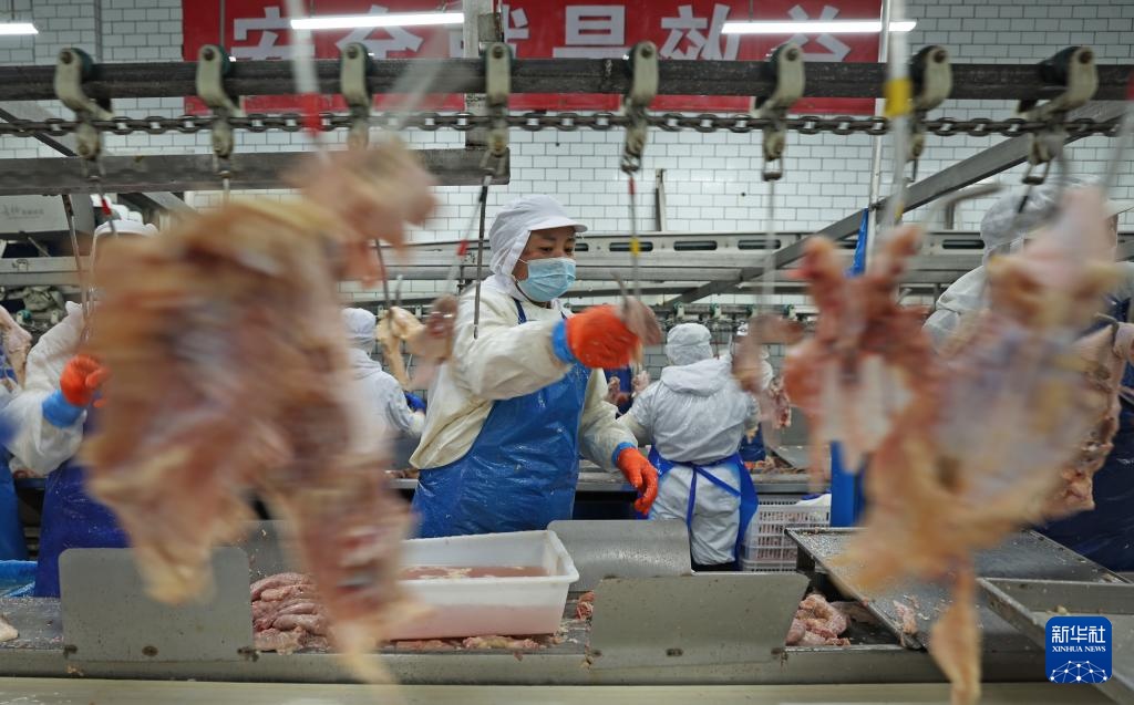 3月11日,在鞍山丰盛食品有限公司,工人在车间加工处理鸡肉。