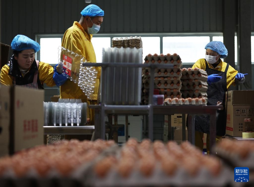 3月11日,在辽宁禾丰蛋业有限公司,工人在车间给生鲜鸡蛋打包装箱。