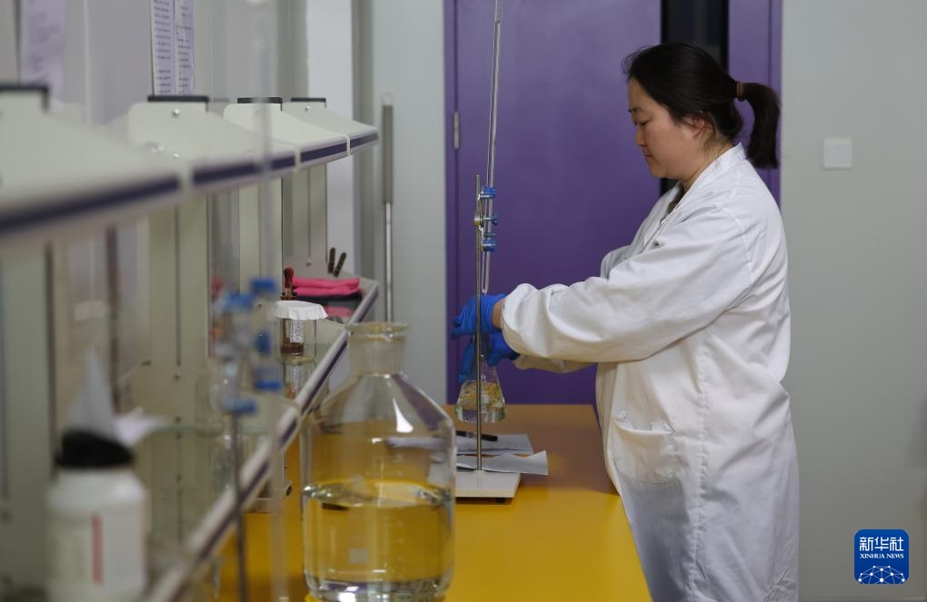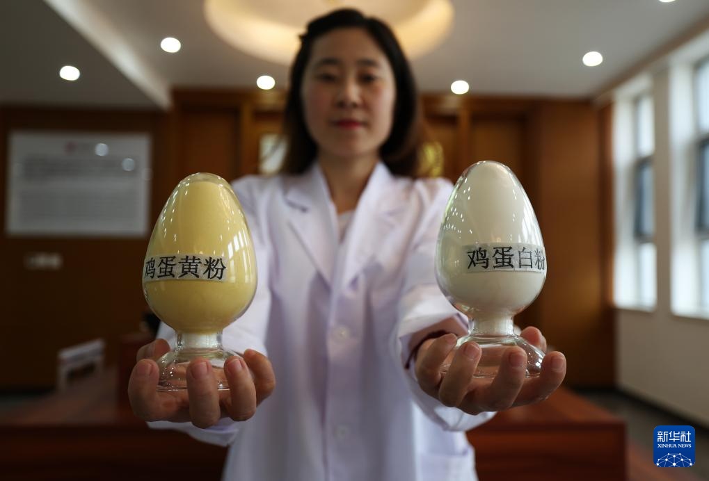 3月11日,在辽宁禾丰蛋业有限公司,技术人员在实验室进行蛋液蛋白质含量检测。