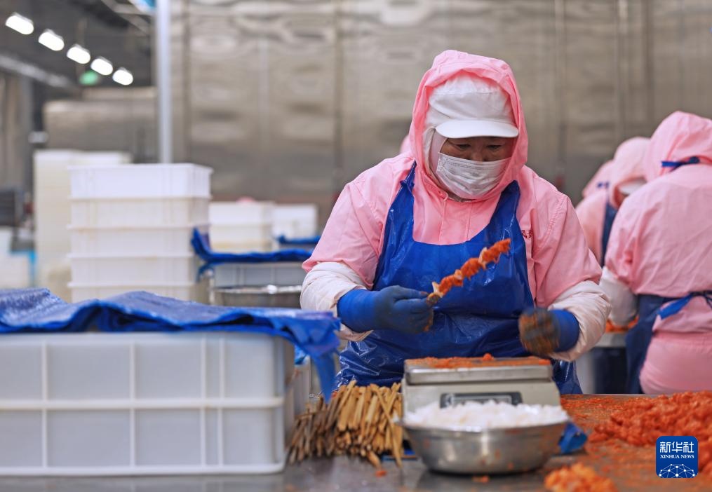 3月11日,在鞍山丰盛食品有限公司,工人在车间加工处理鸡肉串。
