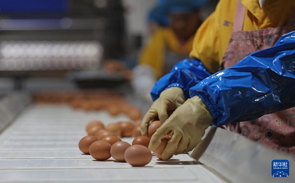 3月11日,在辽宁禾丰蛋业有限公司,工人在车间挑选生鲜鸡蛋。