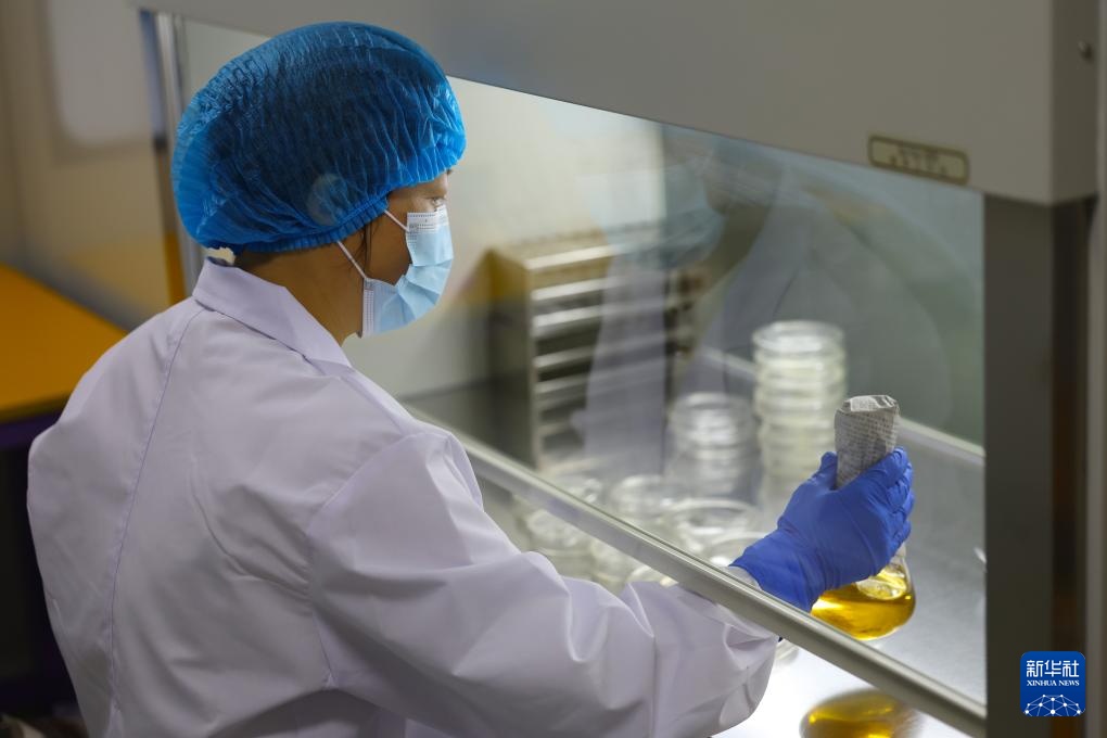 3月11日,在辽宁禾丰蛋业有限公司,技术人员在实验室进行蛋液微生物含量检测。