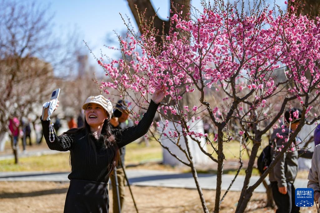 3月12日,一名游客在北京明城墙遗址公园赏花自拍。