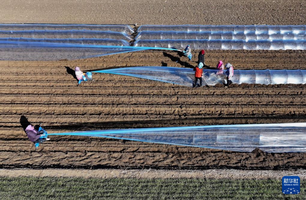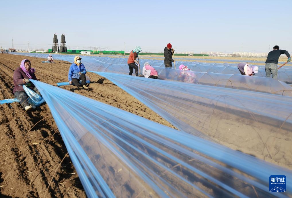 3月11日,丰南区岔河镇四神庄一村的农民在田间为刚播种的马铃薯覆膜。