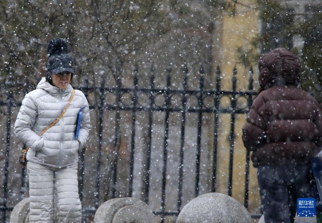 3月12日,市民在哈尔滨市南岗区一处广场上冒雪出行。